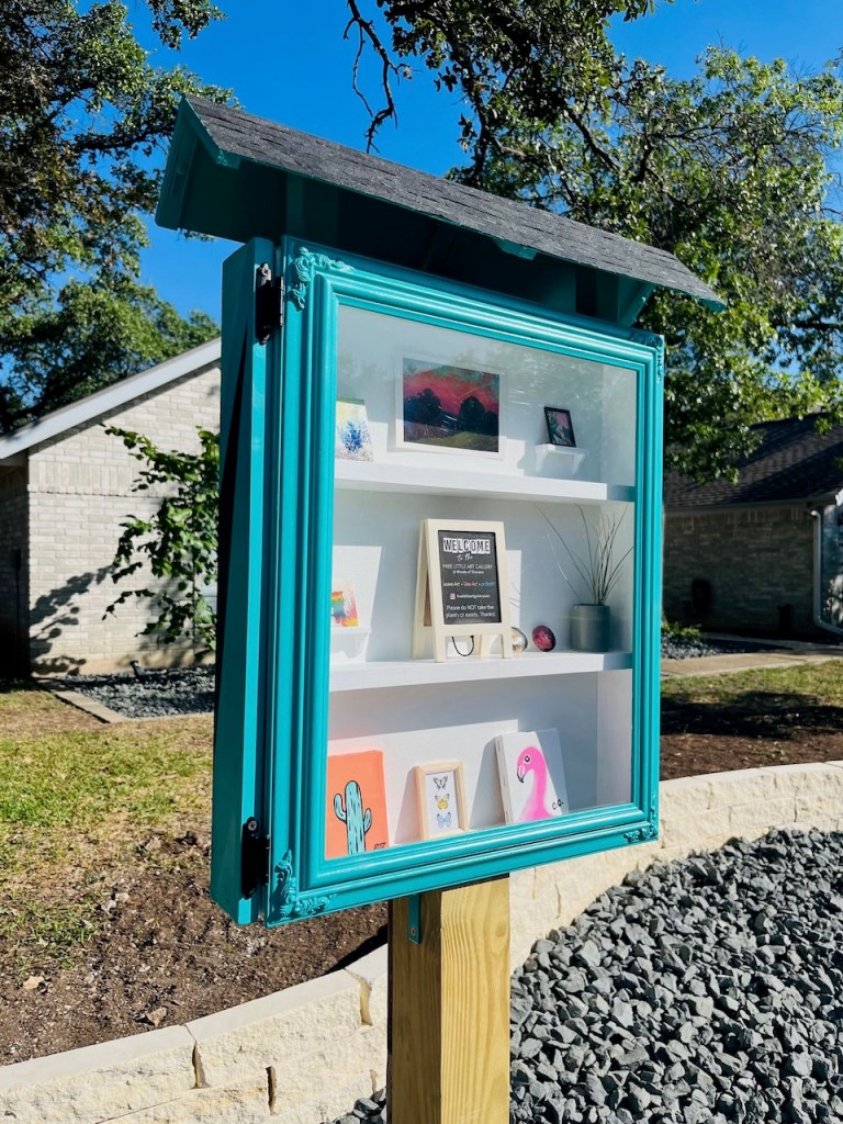 She writes on her site, “In January 2021, I was inspired by a Free Little Art Gallery I saw on Instagram and knew I had to have one for our community. Being that 2020 was such a tough year for everyone, this seems like a great way to bring people together. So, I told my husband I wanted him to build one for me for Valentine’s Day! It’s one of the faster projects we’ve completed over the years and after his hard work, our “Grand Opening” is in a week – stay tuned!”