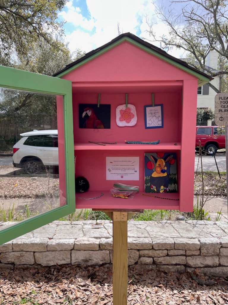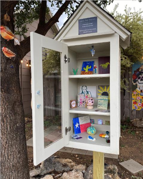 The Little Free Art Gallery ATX is 2711 Harleyhill Dr 78745. Their hashtag is #freeartatx